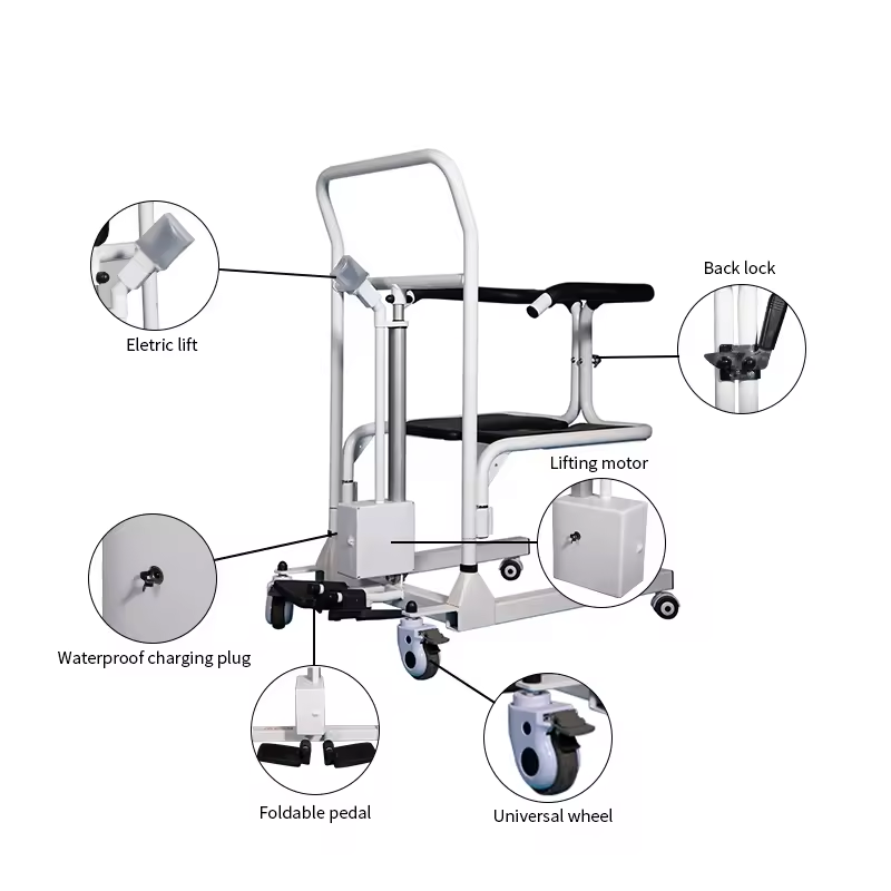 Электрическое кресло для переноса подъемника обеспечивает удобный и безопасный способ передачи пациентов. Уход за больными могут легко перенести пациентов на кровати, ванные комнаты, туалеты и другие места. Сочетание черно -белого красивое и стильное. Основной корпус принимает высокопрочную стальную конструкцию, которая является прочной и долговечной и может безопасно противостоять нагрузке 135 кг. Он может использоваться не только в качестве кресла для переноса, но и в качестве инвалидного кресла, туалетного кресла, стула для душа. Это первый выбор для лиц, осуществляющих уход и их семьи.